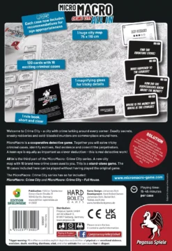 MicroMacro: Crime City has provided detectives worldwide with thrills and innovative criminal hunts in their own four walls! With MicroMacro: Crime City – All In, the next district of the crime-ridden black-and-white metropolis Crime City now opens up for the players. On a new, huge city map, which seamlessly follows the previous plans, 16 tricky crime cases are again waiting to be solved by one to four amateur detectives. These are brand new stories, more sophisticated and criminal than ever before! The aim is to determine motives, find evidence and convict the perpetrators. An attentive eye is just as much in demand as creative powers of deduction to unravel everything on the 75 x 110 cm game board. As a little help, a magnifying glass is included in the game and the individual cases are again marked with symbols, so that parents can decide which cases even the youngest investigators may investigate and uncover. MicroMacro: Crime City 3 – All In can be played completely independently, no previous knowledge from the other two parts is required.