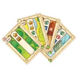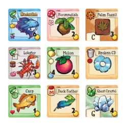 The goal of the game is to complete Grandpa’s Goals and restore the Community Center, which requires you to gather different types of resources represented by tiles. You have a fixed amount of turns to accomplish this. This is driven by the Season Deck of 20 cards, one of which is drawn each turn to trigger certain events. Cooperatively the players decide each turn where they will focus their individual actions and place their pawn in that part of the Valley. Using their actions, they visit specific locations, trying to gather resources to complete their collective goals. Actions include things like: watering crops, trying to catch fish, rolling dice to explore the mines, and many more. When the Season Deck is exhausted, the game ends.