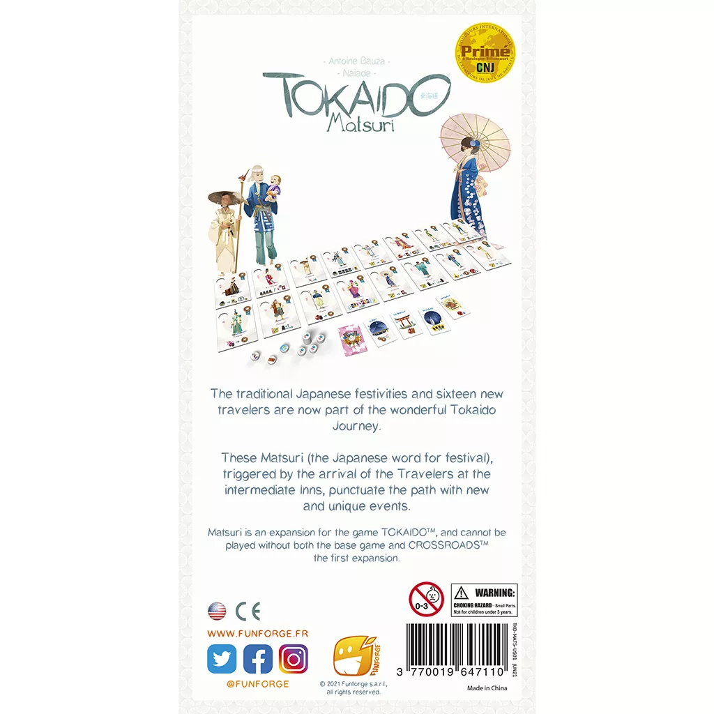 Matsuri is een Tokaido-uitbreiding die nieuwe kaarten en tokens aan het spel toevoegt. Met deze uitbreiding beleven de spelers de Japanse feesten en festivals. Deze kaarten wijzigen de manier waarop elk deel van de weg wordt gespeeld. Dit verandert het spel niet, maar voegt nog meer diepte en strategie toe op dezelfde manier als Crossroads deed.
