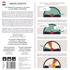 Inhoud: box met daarin het apparaat met de wijzer, 84 Wavelength kaarten, 42 gevorderde Wavelength kaarten, 3 scorefiches en spelregels.